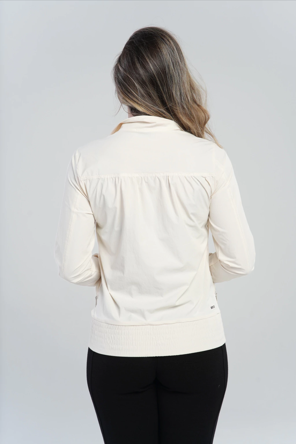 El diseño elegante combina perfectamente con cualquier atuendo, mientras que los detalles funcionales, como los bolsillos laterales con cremallera y el cierre completo hasta el cuello, garantizan practicidad y protección adicional contra el viento en tus actividades al aire libre.