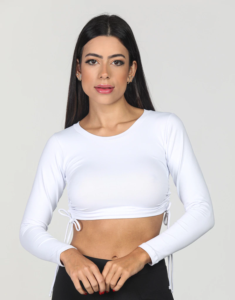 Uma característica interessante desse cropped é o comprimento regulável, que permite ajustar a altura da peça de acordo com sua preferência, tornando-a mais versátil e adequada para diferentes tipos de corpo e estilos. Com mangas longas, esse cropped é uma ótima opção para os dias mais frescos ou para quem deseja uma cobertura extra nos braços.