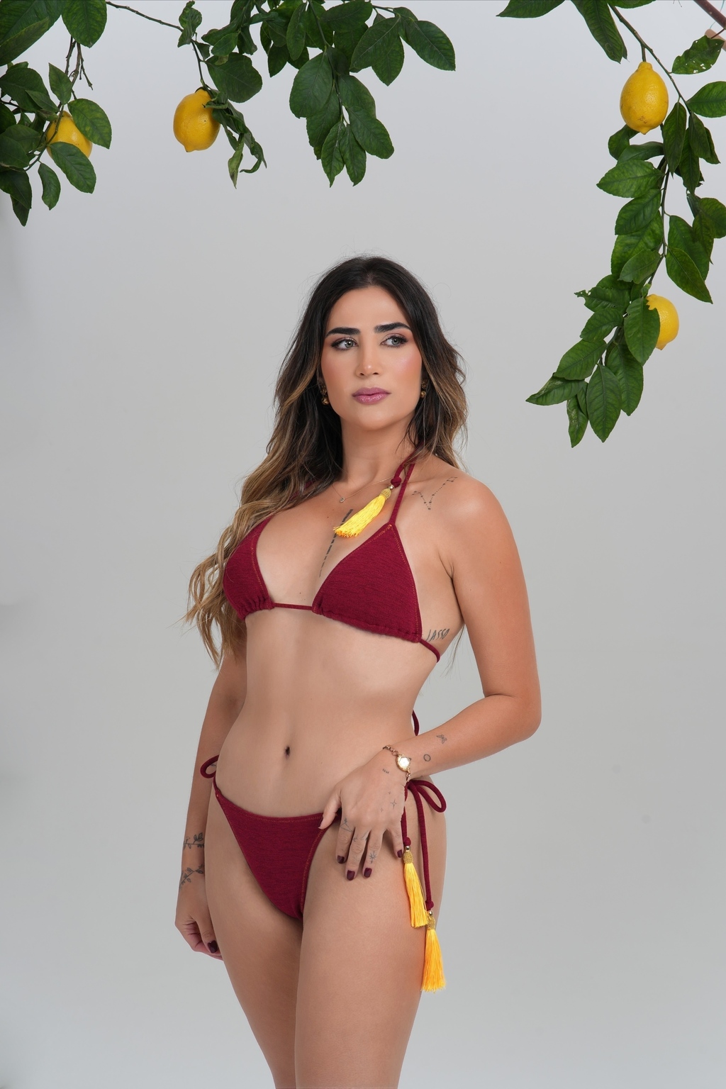 The Cortininha Bikini Top is an elegant and versatile piece, perfect for those seeking comfort and style. Its classic design is timeless and adapts well to different body types, providing a perfect tan line. It features removable padding, allowing you to adjust the volume according to your preference. Elastic reinforcement in all seams and on the neck strap ensures greater durability and security, so you can enjoy summer with peace of mind. The ends of the neck strap have details with gold-plated tips and a beautiful tassel, adding sophistication to the piece.